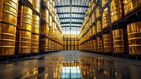 A stunning view of a large industrial warehouse featuring rows of shining yellow oil drums. The reflective floor adds depth to this organized storage space.
