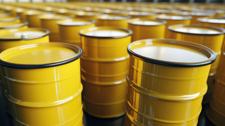 Rows of Yellow Industrial Barrels Aligned in a Warehouse Interior. High quality photo
