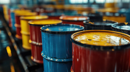 industrial color barrels stand in a row. Containers for fuels and lubricants