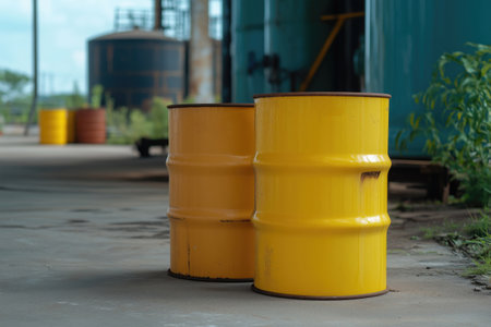 Two yellow barrels on the background of industrial buildings. Industrial background.