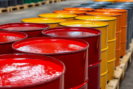 Brightly painted barrels organized in precise lines on wooden skids, illuminated by vivid reflections of red, yellow, orange, and navy hues in a spacious warehouse s