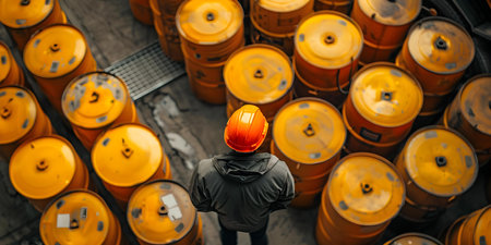 A man in a hard hat inspects yellow oil barrels on truck. Concept Worker Safety, Industrial Inspection, Hazardous Materials Management, Occupational Health, Transportation Compliance