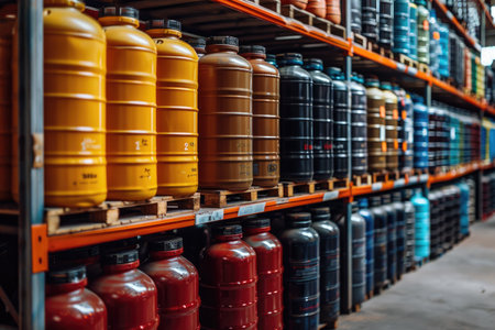 Heavy-duty containers with matte black surfaces and striking yellow bands are meticulously organized in a spacious warehouse, ready for secure handling of industrial liquid