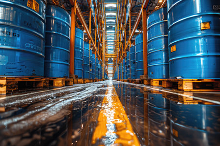 Rows of Blue Barrels Stored in a Warehouse with Reflections on the Wet Floor