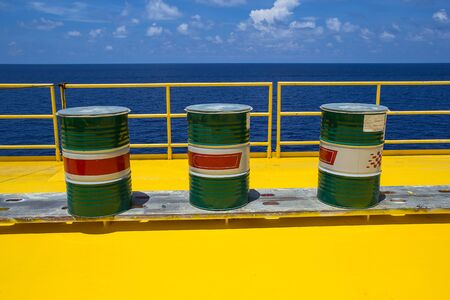Oil barrels three green vertical chemical drums offshore sea Industry.