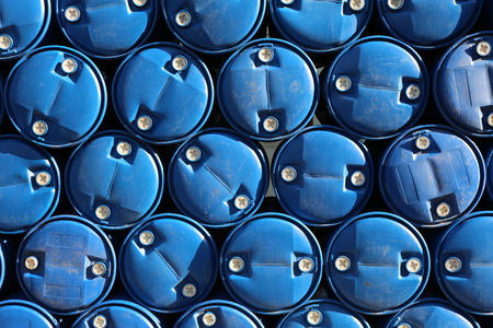 A close-up of petroleum oil barrels stacked, with ample space above for copy