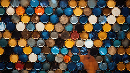 This stunning aerial shot captures a unique arrangement of colorful drums on a floating platform, presenting a vibrant tapestry against the calm waters.