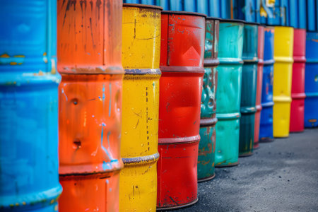 Artistic arrangement of oil barrels painted in vibrant colors, placed in an urban art exhibition.