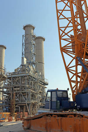 Cranes and lifting mechanisms are located at the construction site of a new petrochemical plant