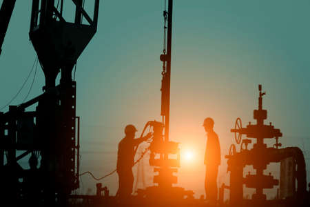The oil workers are working in the sunset silhouettes