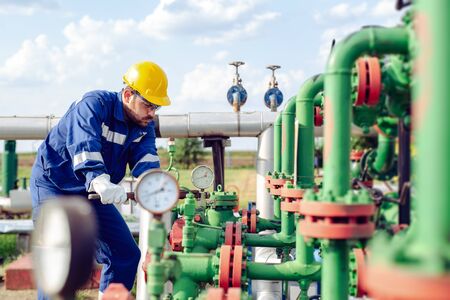 KHARKIV OBLAST, UKRAINE - AUGUST 11, 2015: Employee working on the gas treatment plant into operation at the oil and gas condensate deposit