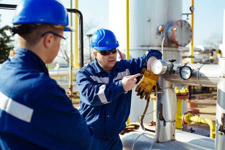 Oil and gas industry. The workers are standing in front of the oil pipeline.