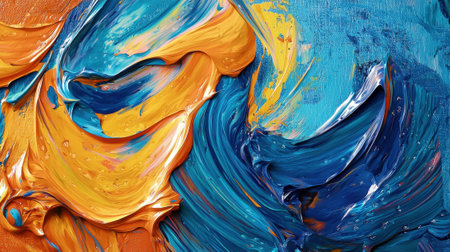 A vibrant abstract artwork showcases swirling colors like orange, yellow, blue, and black. The dynamic patterns reflect creativity and energy, capturing attention and evoking emotion.