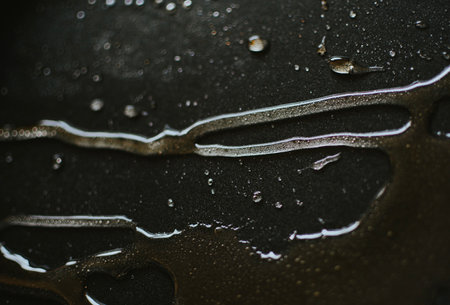 A glistening oil spill can be seen on top of a greasy engine part creating a slippery and shiny texture. The colors range from dark and murky to bright and reflective
