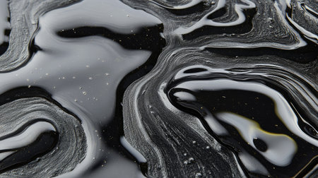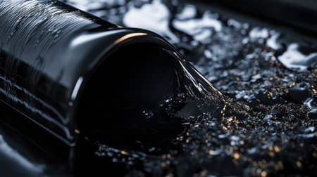 This captivating image features a glimmering black fluid spilling gracefully over a smooth surface, creating an artistic composition ideal for modern design projects.