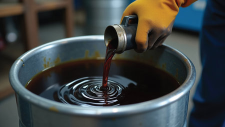 This image captures a close-up view of a dark liquid in a jar featuring visible bubbles and a measurement scale, set within an industrial workshop environment.