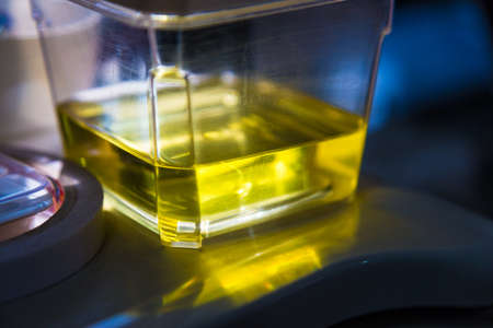 yellow Sacha Inchi, Inca nut, oil in clear cup in dark tone and shallow depth of field