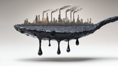 An artistic conceptual image presents a dark spoon filled with a silhouette of an industrial landscape emitting smoke. The spoon and its contents suggest a viscous liquid. This artwork uses a neutral background and focuses on the interplay of light and shadow, potentially serving editorial or commercial purposes related to environmental themes.