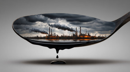 An industrial scene with smoke stacks is reflected in a spoon filled with a dark liquid. The composition uses dramatic lighting and a shallow depth of field. The image conveys themes of pollution and environmental concerns, and may be used for editorial purposes.