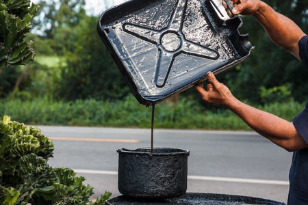 Caucasian oil hands are folded in a bowl of oil. Oil spill. Environmental pollution. an environmental disaster. Copy space