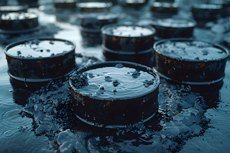 Numerous oil drums are seen floating in the water, clustered closely together. The rusty metal drums contrast with the rippling water around them. Generative AI