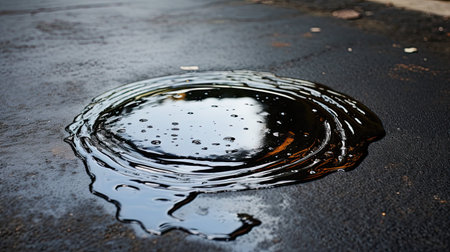 A close-up of an oil puddle on the ground, with intricate patterns and ripples in the black liquid, representing both natural beauty and environmental pollution. This stylish photo shoot features high resolution, professional color grading, soft shadows, low contrast, clean sharp focus, film photography, macro lens, and natural lighting. --chaos 30 --ar 16:9 --v 6.1 Job ID: 776bce9c-24e2-4389-af9c-6cfc8ddb1995