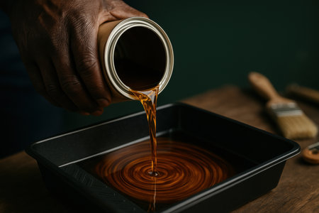Hand pouring wood stain into metal tray on wooden table with brushes nearby for home improvement and diy woodworking project.
