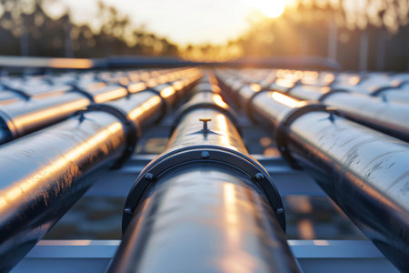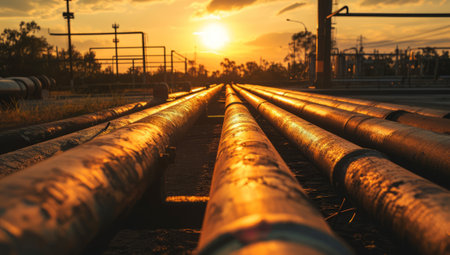 Radiant sunset casts a golden hue on sleek metal conduits, forming a luminous trail that beckons into the horizon across an expansive outdoor landscape.
