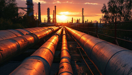 Industrial Pipes Reflecting Vibrant Sunset Colors at Oil Refinery Plant