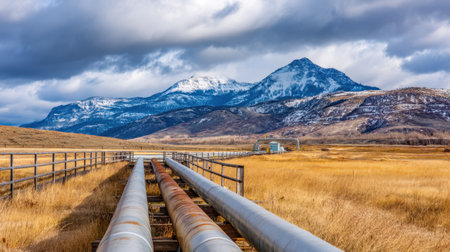 A picturesque landscape featuring industrial oil pipelines running through a golden grass field, framed by majestic snow-capped mountains under a dramatic sky.