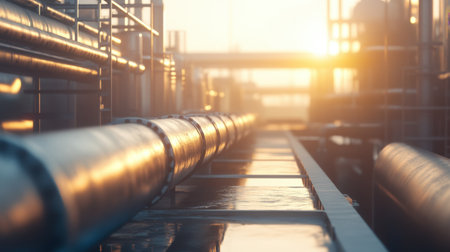A sophisticated industrial pipeline network with reflective surfaces glowing under the soft touch of sunlight.