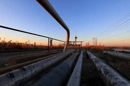 Pipeline of oil and gas on sunset background. Oil and gas industry
