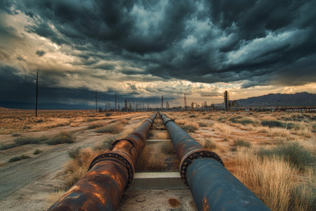 Oil pipeline in industrial desert landscape with metal infrastructure and dramatic skies