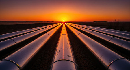 A large pipeline is silhouetted against a stunning sunset, creating a captivating industrial landscape, Pipelines against a backdrop of a fiery sunset, AI Generated