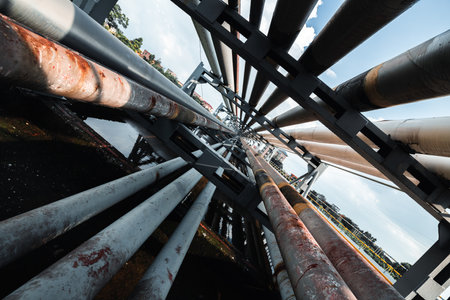 Detailed view of pipeline and support structure in petrochemical plant for industrial applications