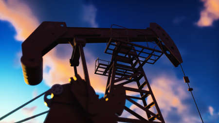 Pump jack industrial machine for petroleum in the sunrise. Silhouette of a pump jack pumping oil against a red sky. 3D Rendering