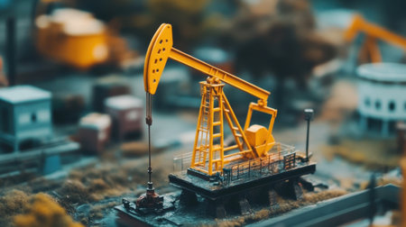 Yellow oil pump jack model in a close-up shot, highlighting the energy industry's key role in fossil fuel extraction.