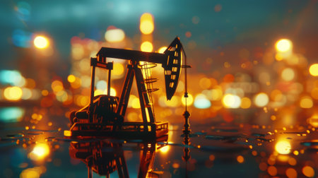 A striking image of pump jack reflecting on wet ground, illuminated by city lights