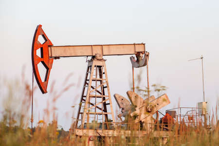 Oil pump, oil rig an industrial oil production standing in the field. Technology concept, fossil energy sources, hydrocarbons. Mixed media copy space.