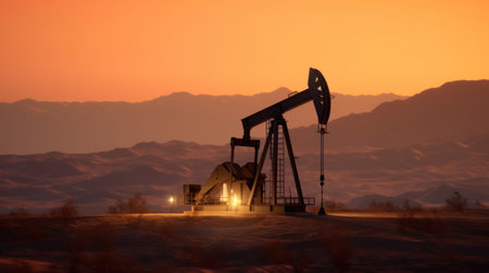 Crude oil pumpjack rig on the desert silhouette in evening sunset, industrial energy machine for petroleum gas production