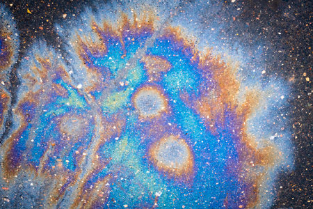 Colorful iridescent oil slick on a textured dark surface, showcasing vibrant patterns and shimmering hues. Nature and environmental concept, focusing on fluid dynamics.