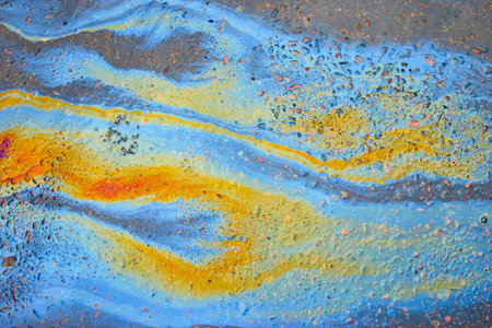Colorful oil slick on wet surface creating vibrant abstract patterns and reflections. Environmental pollution concept with bright blues, purples, and greens.