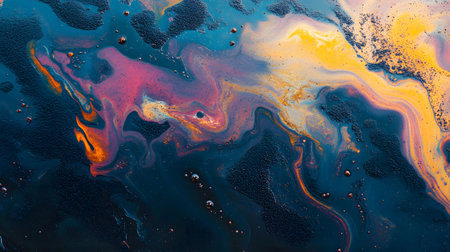 Colorful iridescent oil slick on a textured dark surface, showcasing vibrant patterns and shimmering hues. Nature and environmental concept, focusing on fluid dynamics.