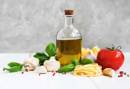 Italian food ingredients, olive oil, spices, pasta and tomatoes on a white wooden table