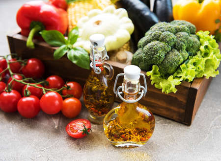 Box with different raw vegetables and olive oil on a concrete background
