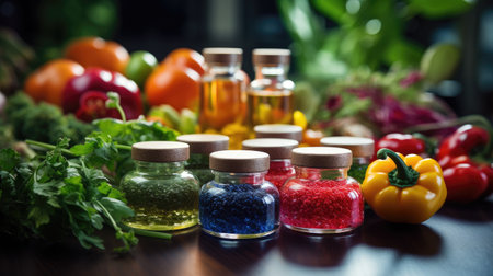 Variety of colorful vegetables and herbs in glass jars on wooden table
