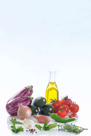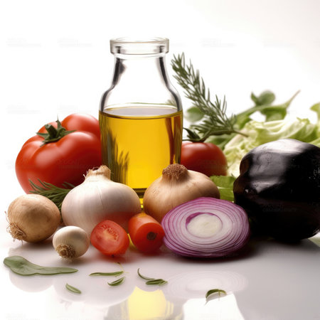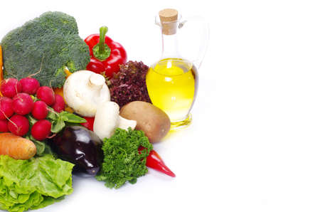 fresh vegetables and oil still life isolated
