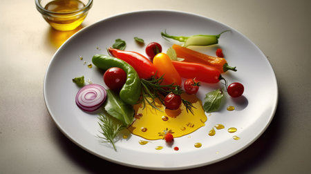 A variety of colorful and fresh vegetables, including tomatoes, cucumbers, peppers, and onions, displayed on a white background. The vegetables are coated with a drizzle of golden oil, giving them a healthy and vibrant appearance, Ai Gennerated