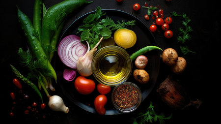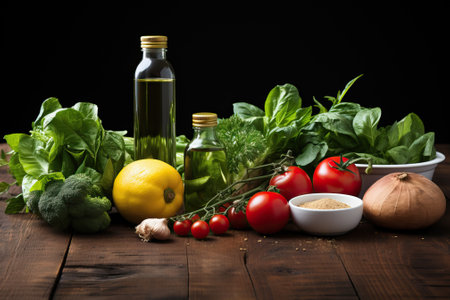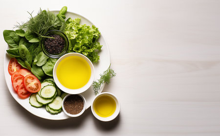 Vegetables and greens laid out for salad, vegetarian food preparation. low-calorie diet menu, vitamins from products Generative AI