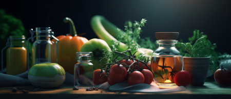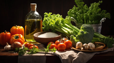 A rustic still life arrangement featuring bottles of olive oil, fresh vegetables, and grains on a wooden surface. The warm lighting and natural textures make it ideal for themes related to Mediterranean cuisine and organic food.